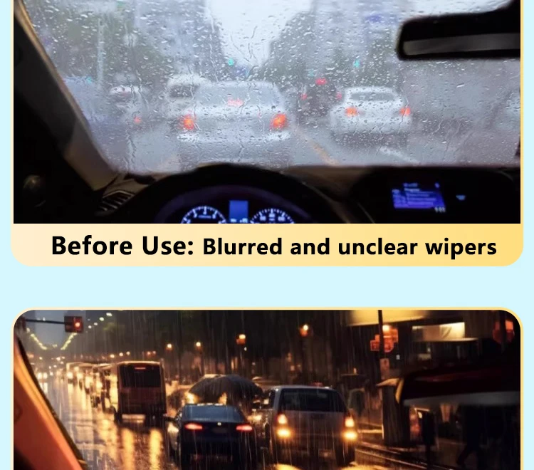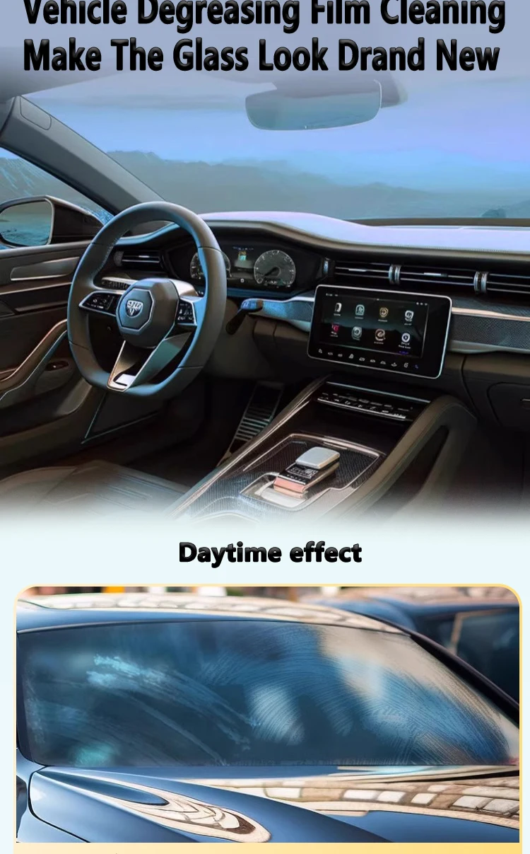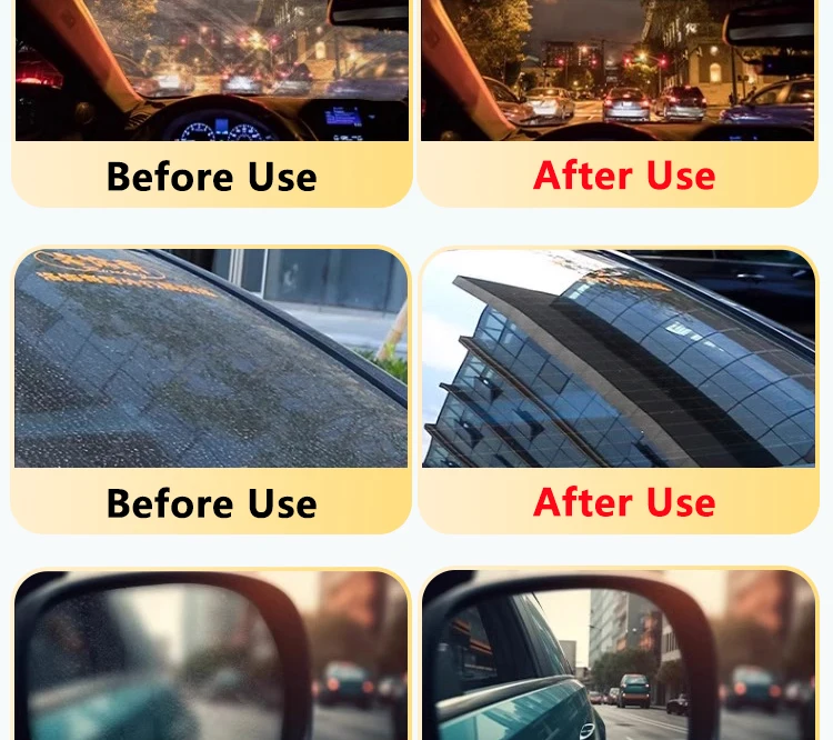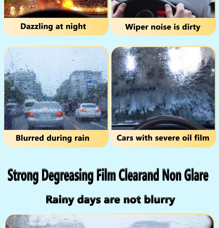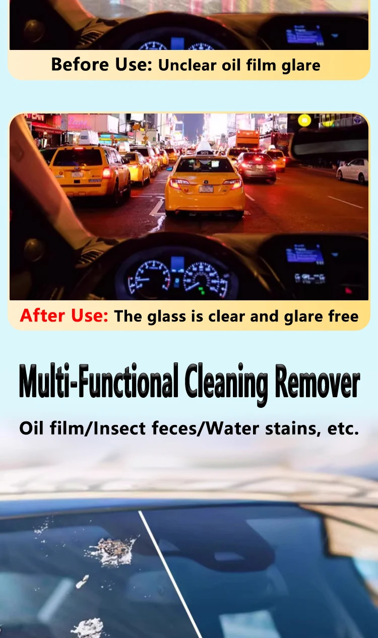 • The unique formula effectively removes the oil film formed by vehicle exhaust, pollution and resin, solves the problem of glare and blurred vision, and ensures that water droplets will not hang on the glass and affect vision when driving on rainy days.