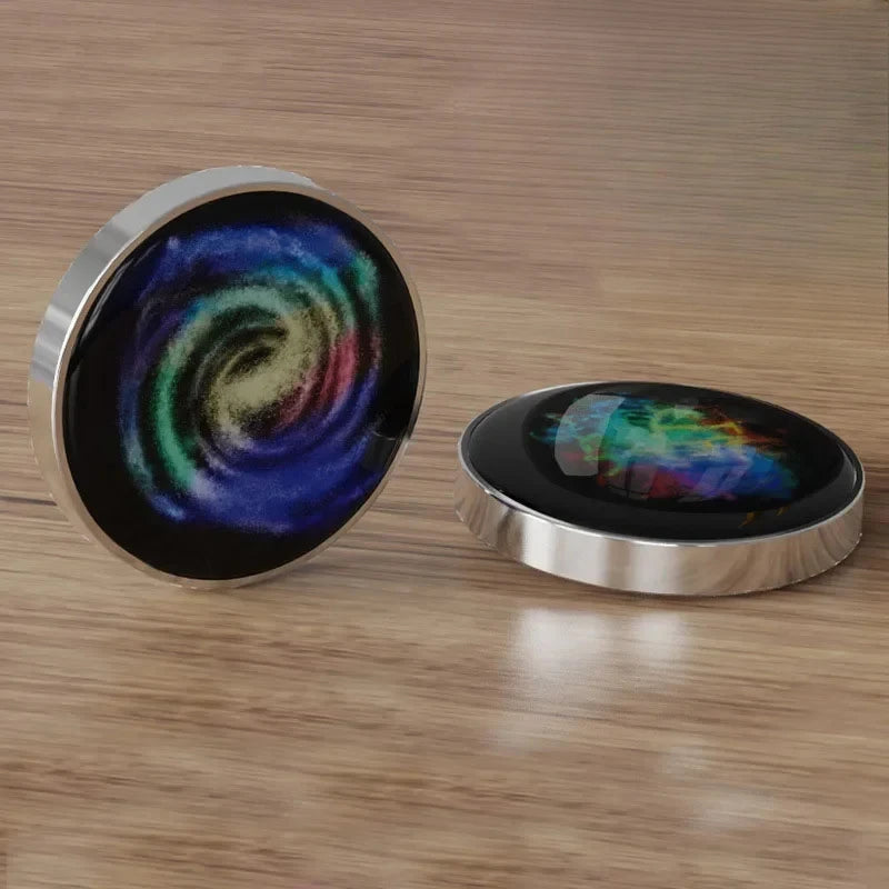 It's a pocket-sized spinning coin with a spectroscopic holographic space photo encapsulated under a clear resin that brings together the real state of space! As the product rotates, each one takes on a different pattern with captivating optical effects, as if you were actually observing space, the product is hand-polished, combined with a high level of craft resin and stainless-steel metal, enabling the product to work on office desks Presenting the beauty of the Milky Way starry sky and enhancing the holographic image!