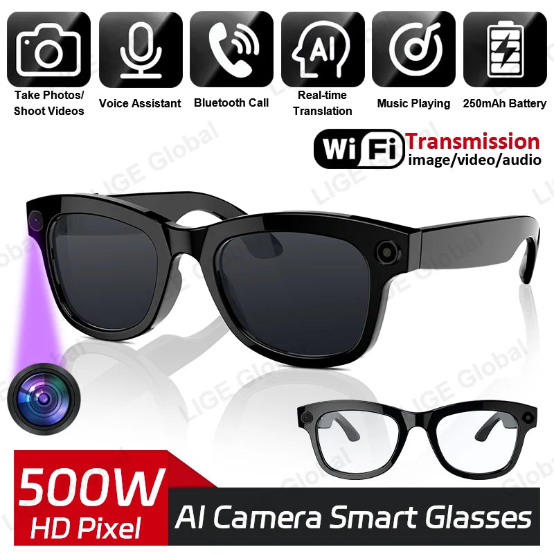 LIGE AI Smart Camera Glasses 500W HD Video Recording 250mAh Battery Voice Assistant Translation Calling Music Outdoor Sunglasses